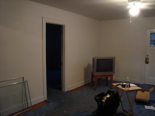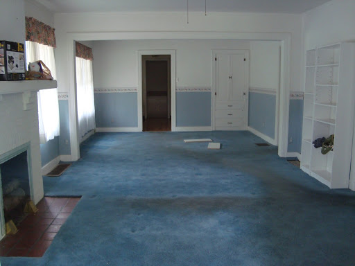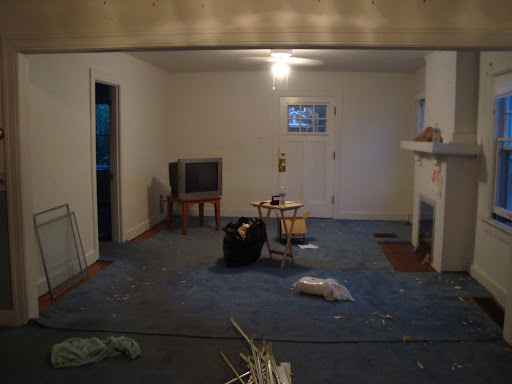 After they finally left – Pat & I stood around for a minute, and then started ripping up the carpet, because we couldn’t wait any longer to see what the hardwood floors looked like. In 3 out of the 4 rooms, we hit the hardwood floor jackpot. They probably won’t even have to be refinished – maybe resealed at most! But, there was a small spot next to the register in the living room that we’ll have to have replaced. (And for that 4th room – a large section had been replaced in the past, but no one bothered to even the flooring, or match the wood/stain, so we’ll have to have that replaced/fixed too.)