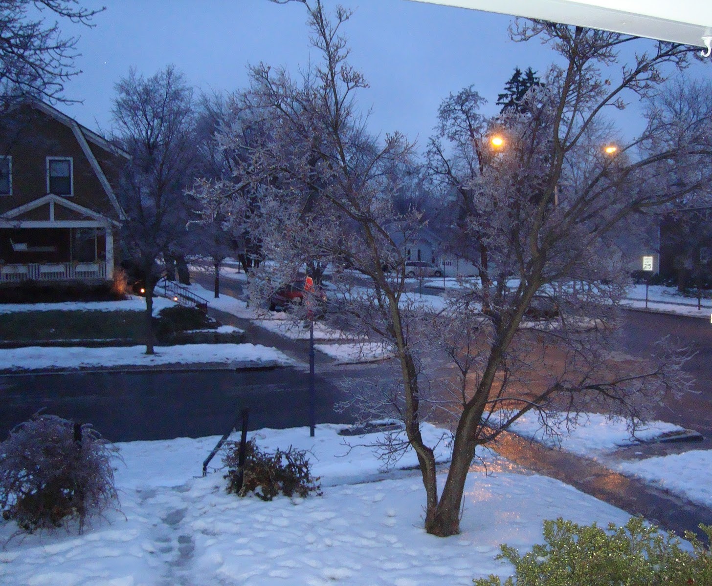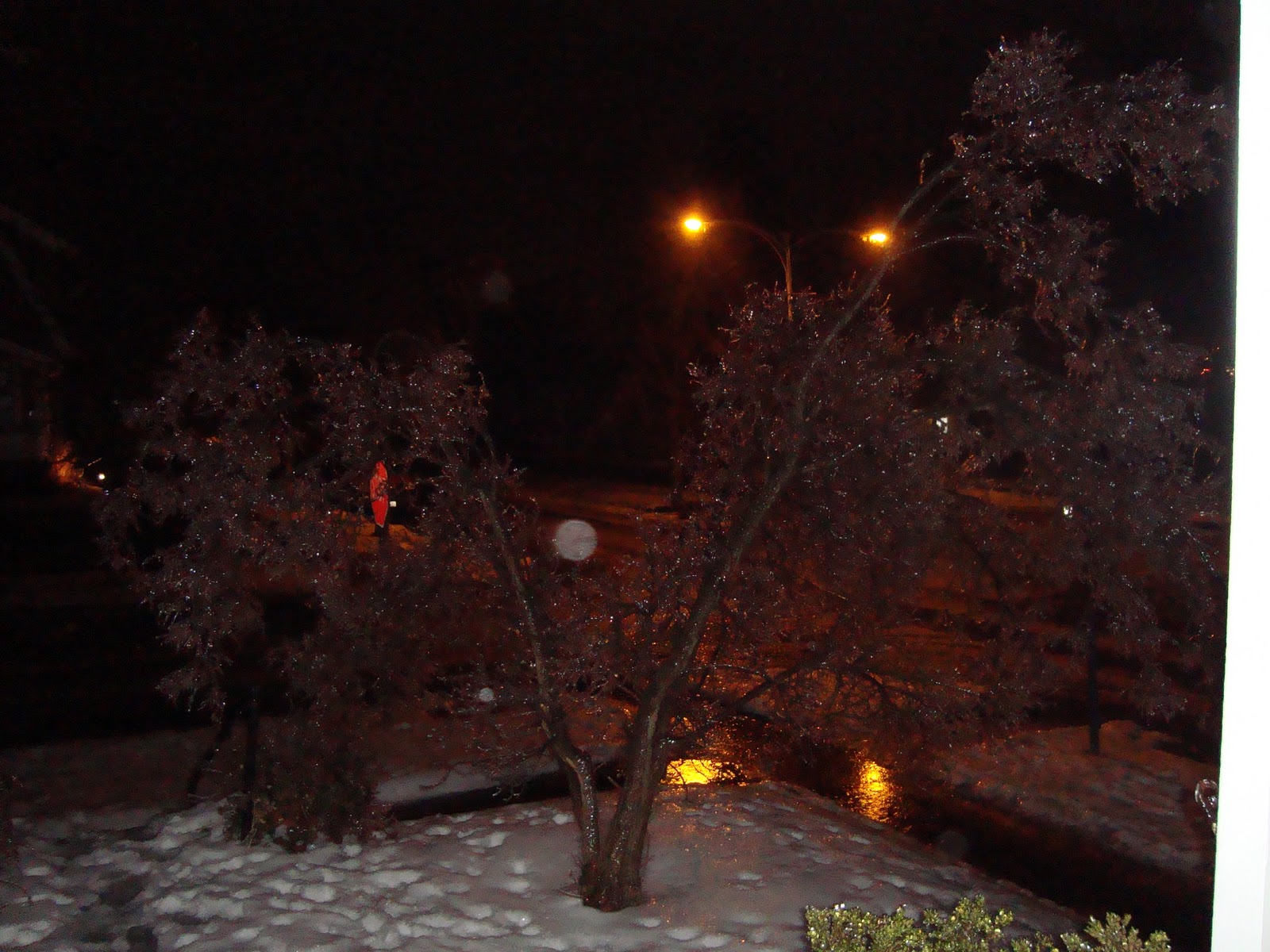 | First night … with the fist round of ice crystallizing the tree, ground, bushes, and everything! |