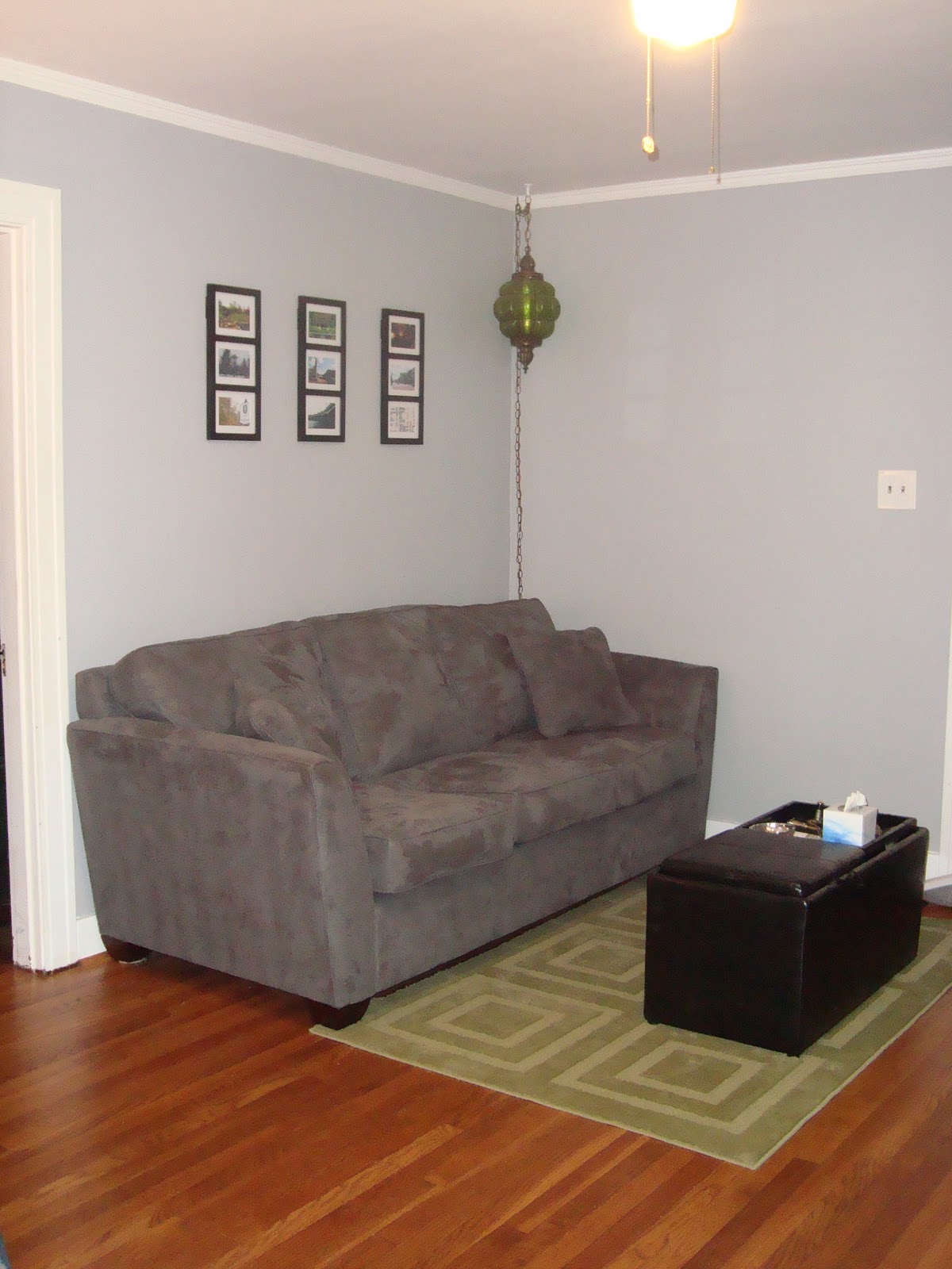 We have some pictures up on the walls of our living room, making it look and feel like more of a home. We also bought another new rug. Now with the rest of the furniture in the LR/DR area, the previous rug we bought just didn’t quite match and it really stood out. So, I didn’t buy the lovely, expensive rug I really wanted, but we were able to find a Target rug (aka, inexpensive, but looks good) that matches much better and really pulls the green out that we/I are/am accenting with!