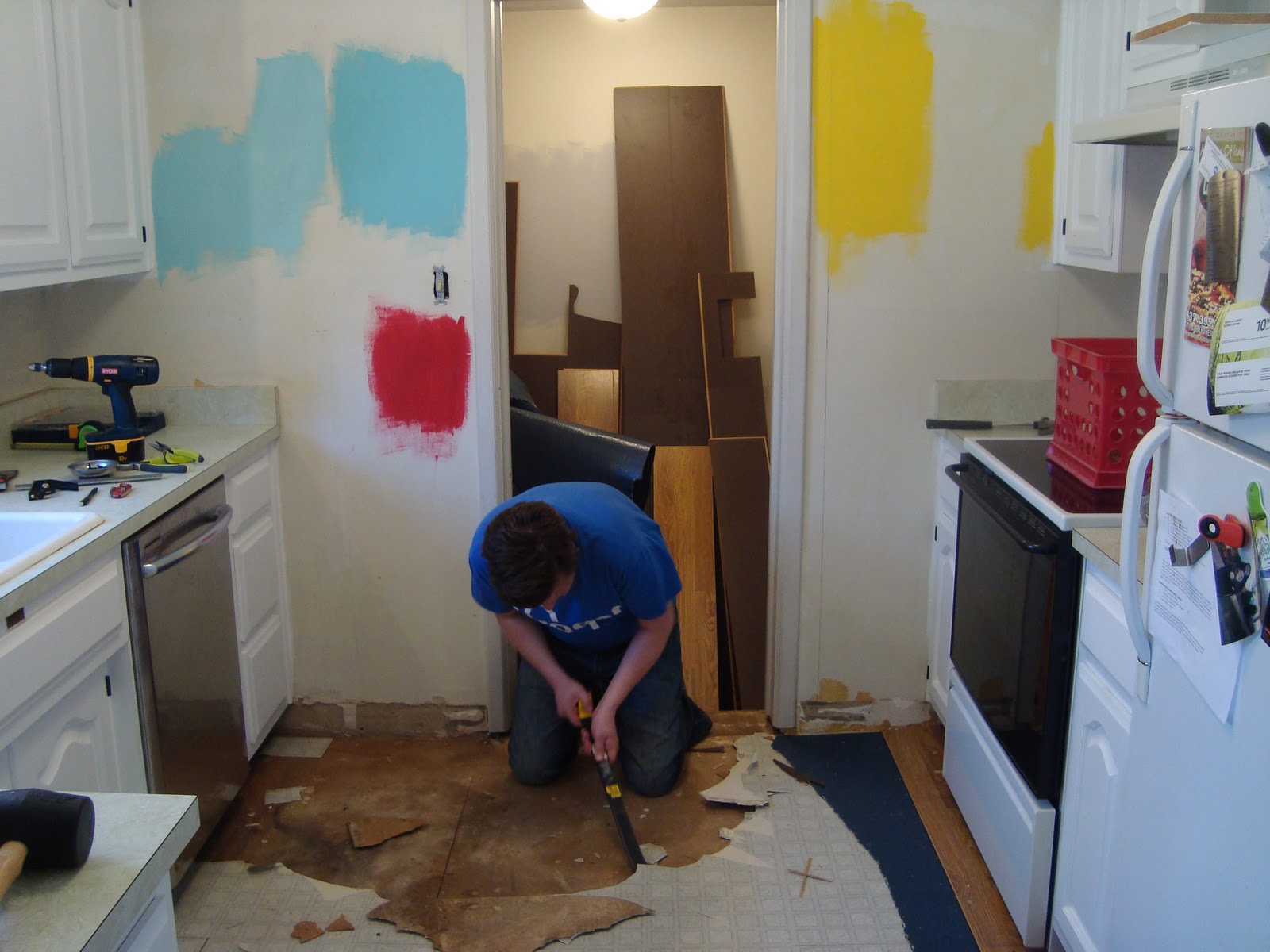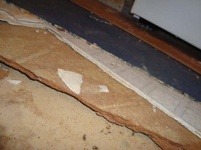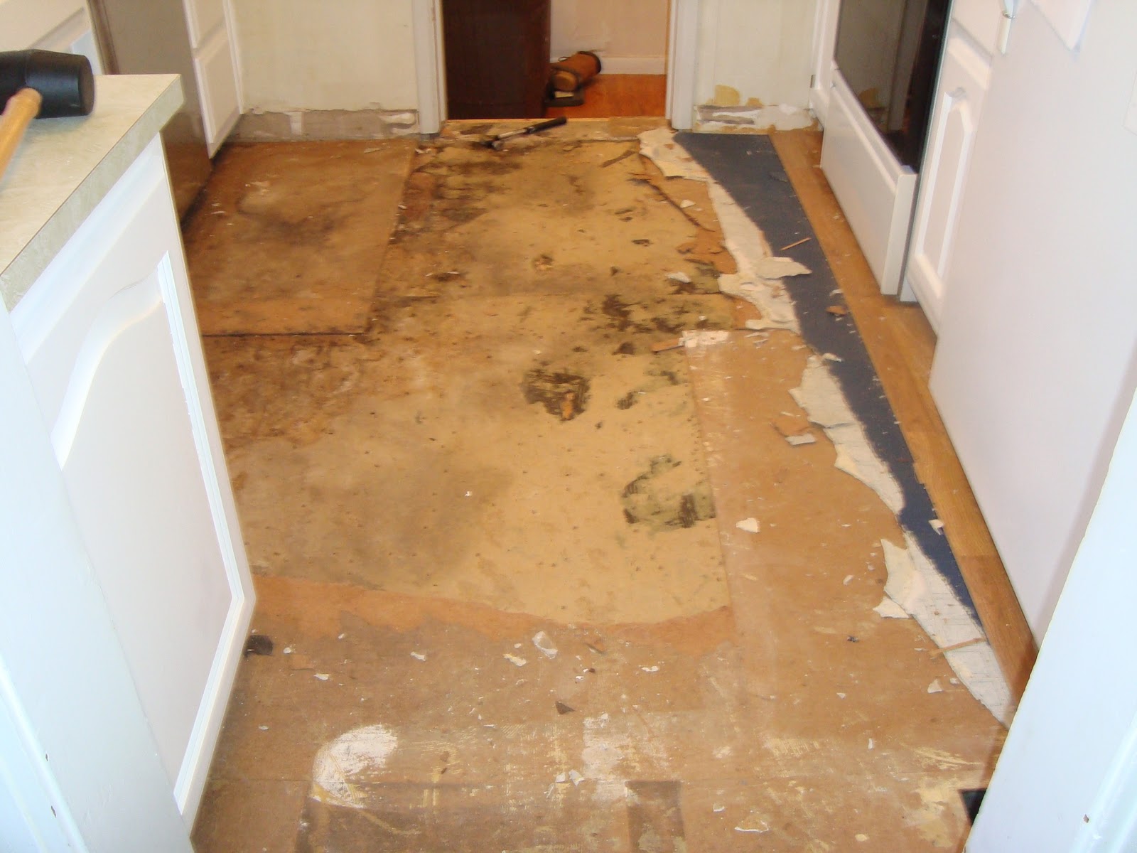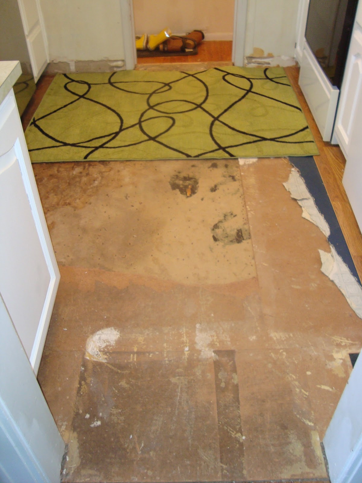 It all started with a nail. It was late. It was Saturday night. We had just gotten back from dinner and a few drinks at a local bar and grill. It was 10pm or later. We had spent the morning running errands, and the afternoon drilling, screwing (actual screws with screwdrivers), and hanging the kitchen cabinet doors, among a few other household chores. The cabinet doors – they look like shit. The just-painted paint had started peeling. The cabinets themselves looked pretty good, but the doors, well, they don’t look so good. I had blisters and had ripped my pants on the (crappy) kitchen flooring while hanging a lower door. We were both beat and frustrated. We decided to rip up that nail from the floor that we just always in the way. It ripped pants. It scratched sock-protected feet. It just stuck up from the floor, mocking us as one of the last bullshit annoyances left to us by the people who owned this house before. We’ve hated it since we moved in. So, Pat pulled up that nail and tossed it in the garbage. Then, we found another nail, so we pulled up that nail too. Then there was another and another and another … and then we wanted to see what was under all that laminate, vinyl, and sub-flooring. So, Pat started demoing. We ripped up a piece of laminate flooring about 2’x2′ that night, along with the same size padding, vinyl, more laminate, and sub-flooring. Underneath it all, we found the original hardwood floors. As expected though, they were toast. ruined. glued. damaged. moldy. I had held out about 10% hope that we’d find great floors down there. No such luck. Oh well.