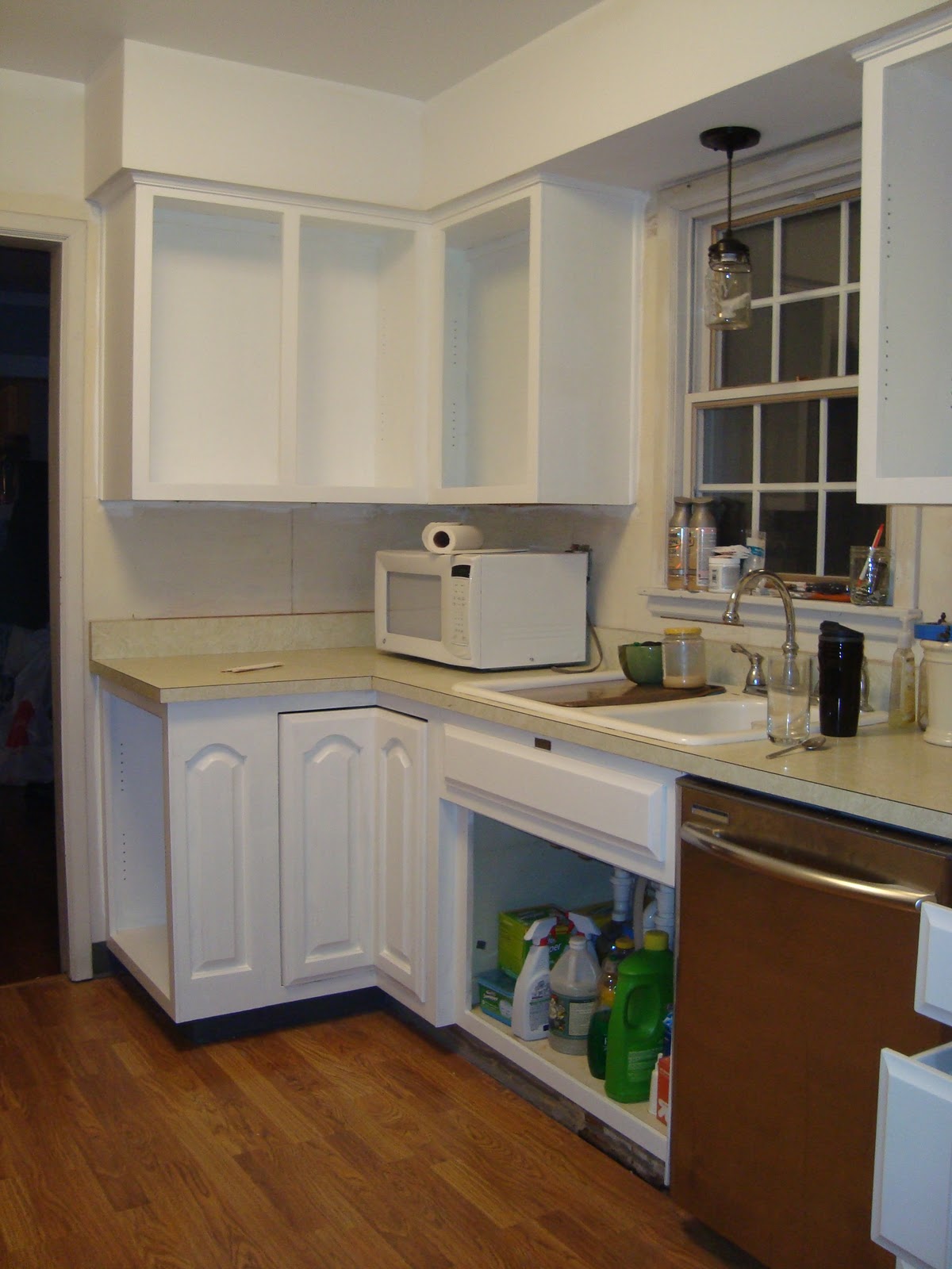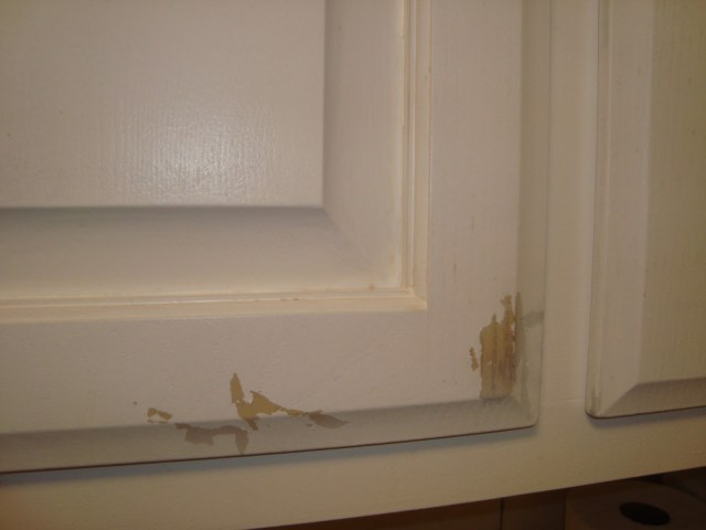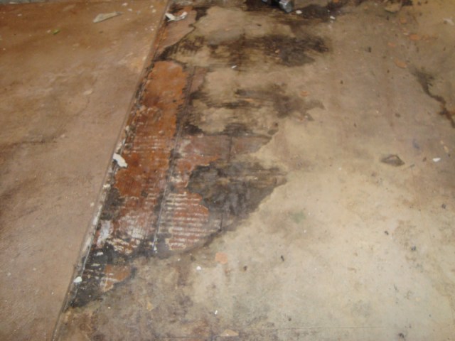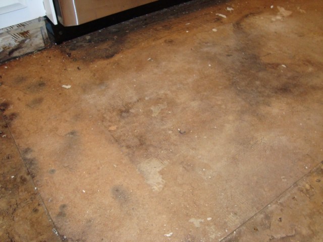Forward to Sunday. Pat starts ripping out more of the floor because … well, we’ve demoed part of it, might as well take it all out. As we try to get the laminate, faux-hardwood out, we peel off the “baseboards” (baseboards = glued on pieces of rubber that are typically used in restaurants or commercial spaces = super ugly). So, I tear off one piece of baseboard and look at the back. I only look because I had to really pull to get that sucker off of the wall. And, right there in the middle of the glue are bugs and bug eggs, larvae. GROSS. I can’t handle that. This glue was super-duty. Meaning, these things had to have been there when they put this glue up. TOTALLY GROSS. And, then comes more vomiting. (If you’re counting, that’s twice that this house’s grossness had pushed me to the point of vomitness.) After that, Pat demos by himself, while I do taxes – in another room, no where near the disgustingness that is our kitchen floor. After about 30 minutes, he comes to get me and says we need to make a decision and that I need to come and look the kitchen.