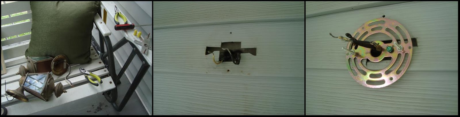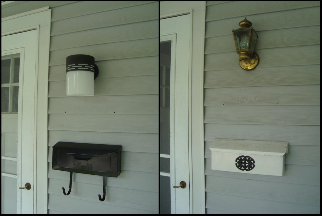 Replaced the front porch lights!!! These lights look a bit modern now that they are actually hanging up; but I think that once I replace the lattice with railing, and paint the porch, etc. – they might be more suitable. Also we got a new mailbox!! And removed the ugmo street number sign. There were sticky street numbers under that – dumb. They didn’t even bother peeling them off before hanging something over it – why do more work than necessary!?