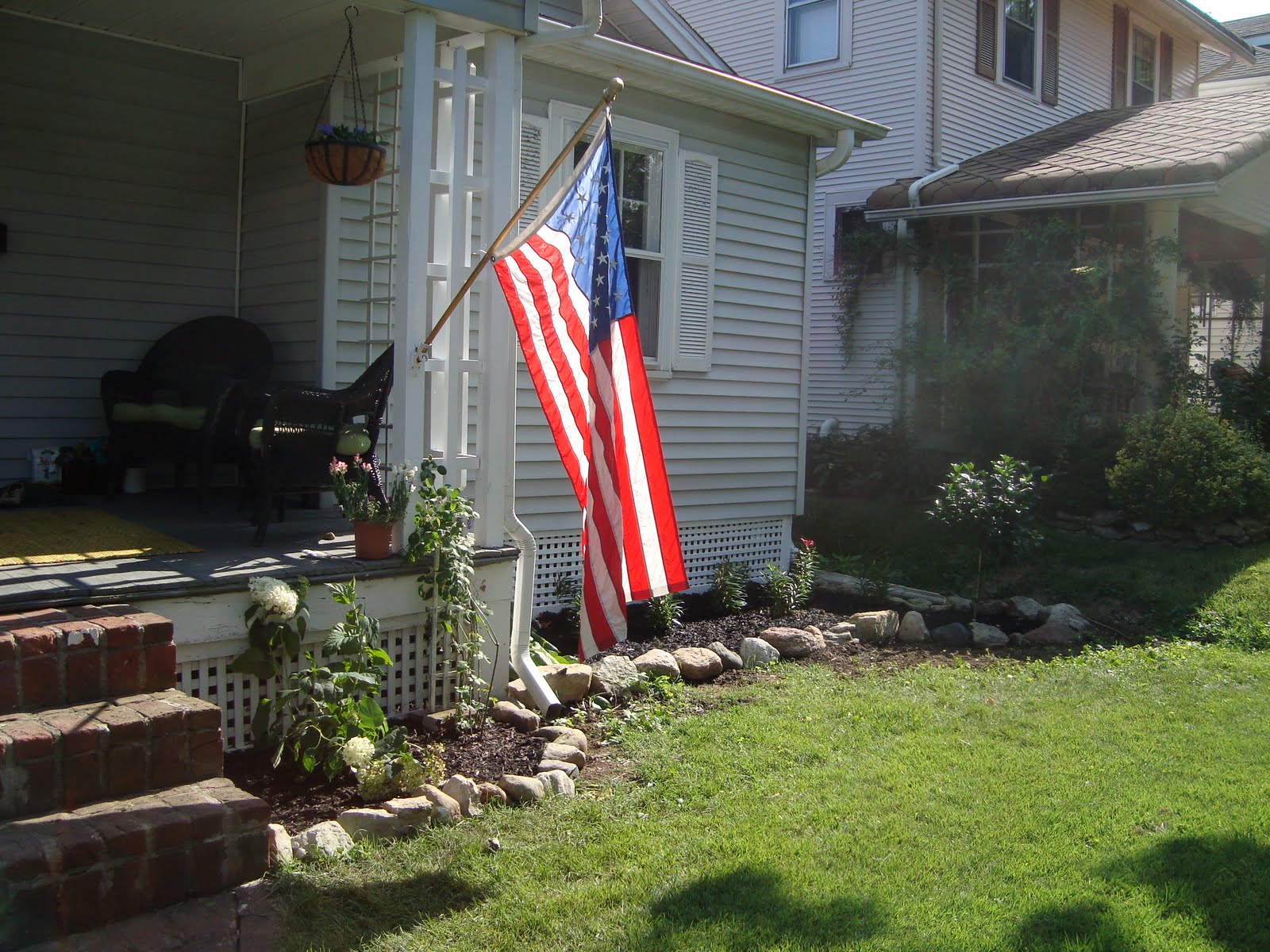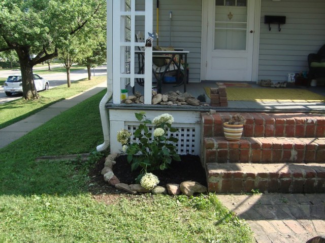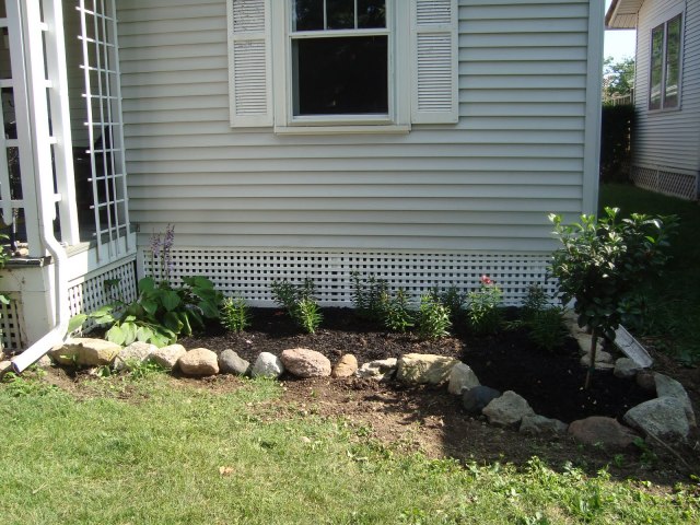 We finished the front yard! Lilies, gardenia tree, top soil, black mulch, hostas, hydrenda bushes, rock borders, grass seed, and lots of sunlight and water = an awesome front yard! We plan to plant some tulips in front of the lilies this fall, and maybe try to find some perenials that we can put up there too … that way, next year, we’ll have tulips in the spring, with a tree & bushes; and then lilies and *something else that comes up annually without me having to re-plant it* with the tree & hydrenga bushes blooming all summer. We still think it’ll looks pretty sweet now though (and all the work later is just gravy … not necessary, so we count this as DONE).