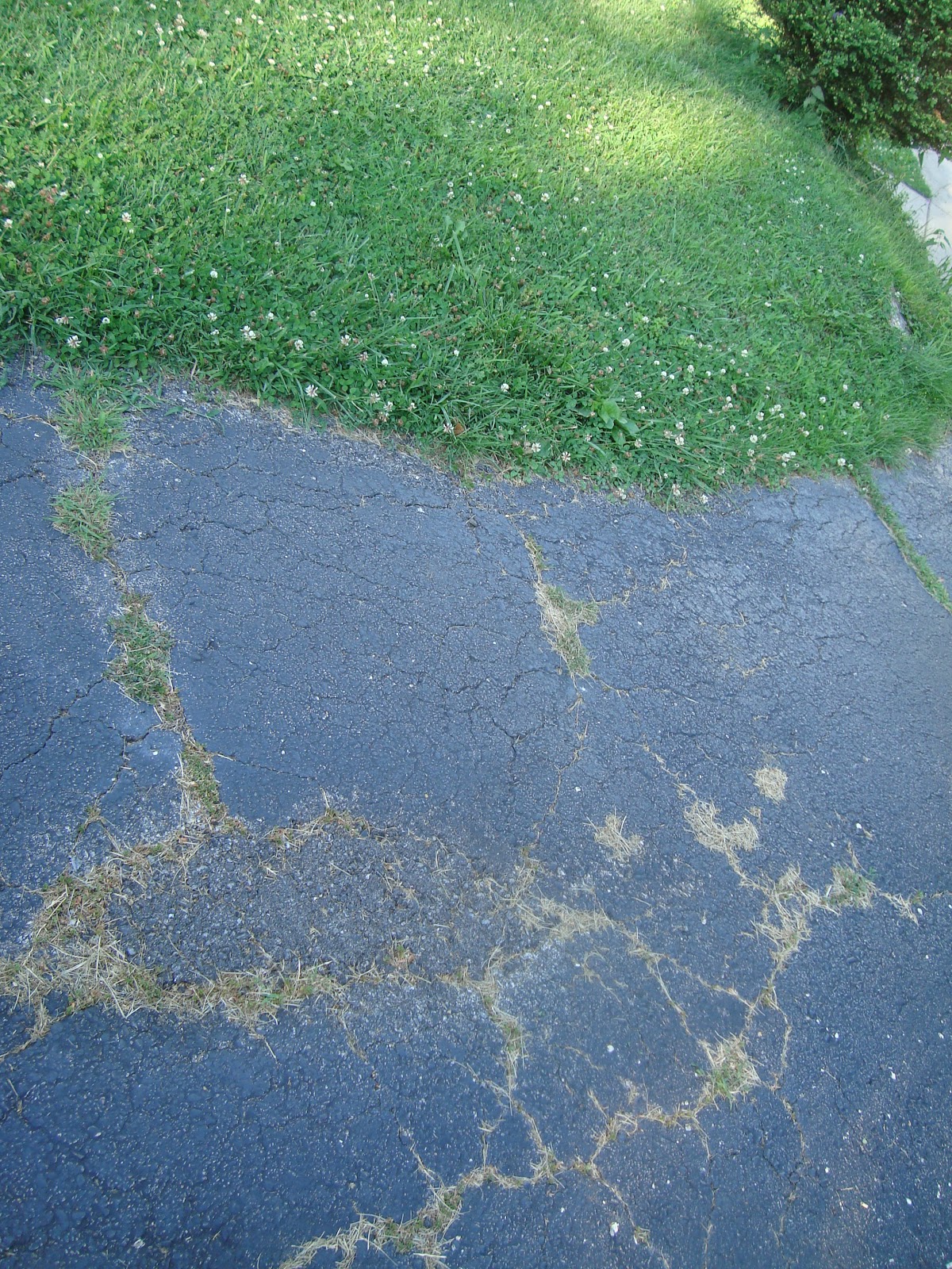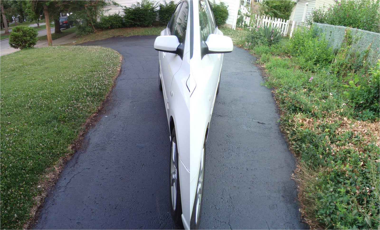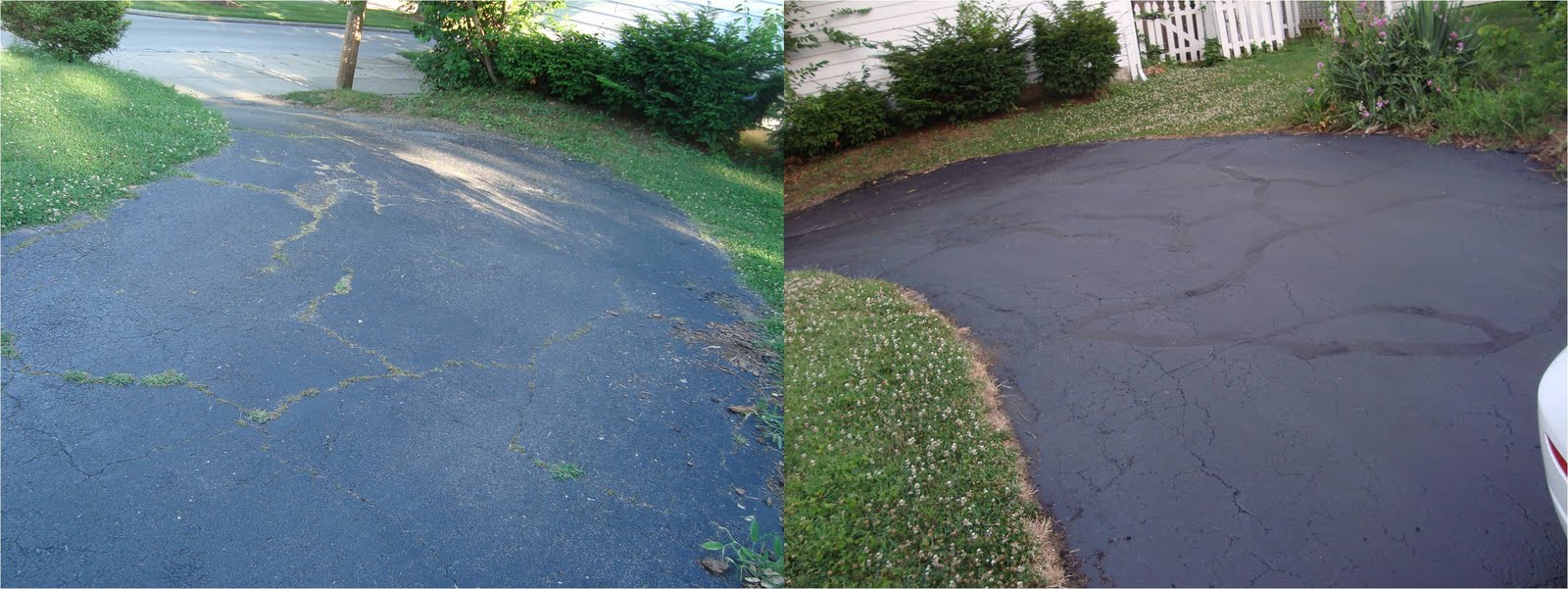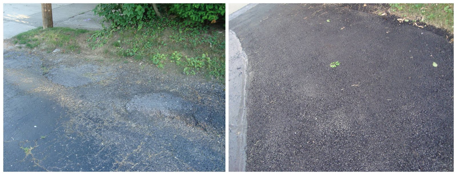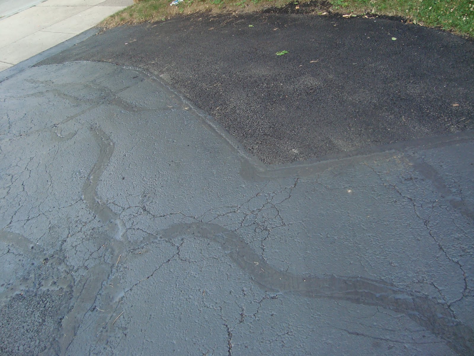 We had the driveway re-sealed and partially re-paved. When we bought the house, there was a list of things the city wanted fixed (or they kick us out). We split it with the past owners, partially because (a) they weren’t going to do them; (b) if they did have to do them they would have half-assed them (obvious from past findings); and (c) we wanted to do them our way. The driveway was one of these items. It was in bad shape. There were pits and holes; the cracks had at one time been filled (inproperly); the weeds/plants next to the driveway were growing over the blacktop; it was crumbling. So, we hired a company to fix it – it was b.e.y.o.n.d. repair kits purchased at Home Depot. They had to dig up a portion of the driveway and re-fill it. They had to seal the rest of the driveway. (We were unaware that the newly layed part of the driveway had to cure for a year before it can be sealed; but it does, and we know now. We’re becoming very smart, and after this house-fix-up, we might know everything, you can ask us then.) We now have a driveway about twice as big as it was before; and it looks black; and it’s smooth. Feast your eyes on this: