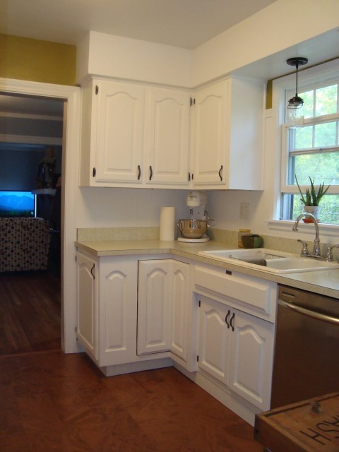 And, it’s starting to look pretty good in here. It’s a good start. Actually, it’s a really good most-of-the-way-finished start. Painted cabinets, check. New cork floor, check. New baseboards, check. New matching door molding, check. New pulls on the cabinets, check. Painted walls, check. Blinds hung, check. Countertops, sink, stove, and refrigerator … coming later. The only thing left to do is hang the aluminum tile backsplash behind the stove … I ordered the tiles, and they have arrived, and are sitting in our dining room in two very small boxes … and I swear its going to be done soon because I’ll be damned if this kitchen remains ‘unfinished’ for another month.