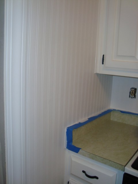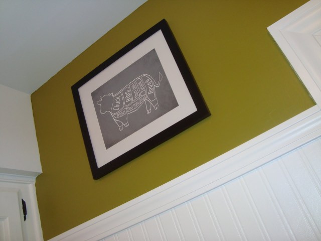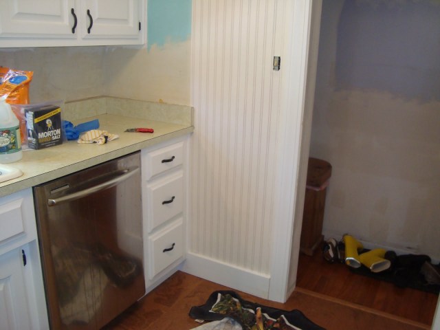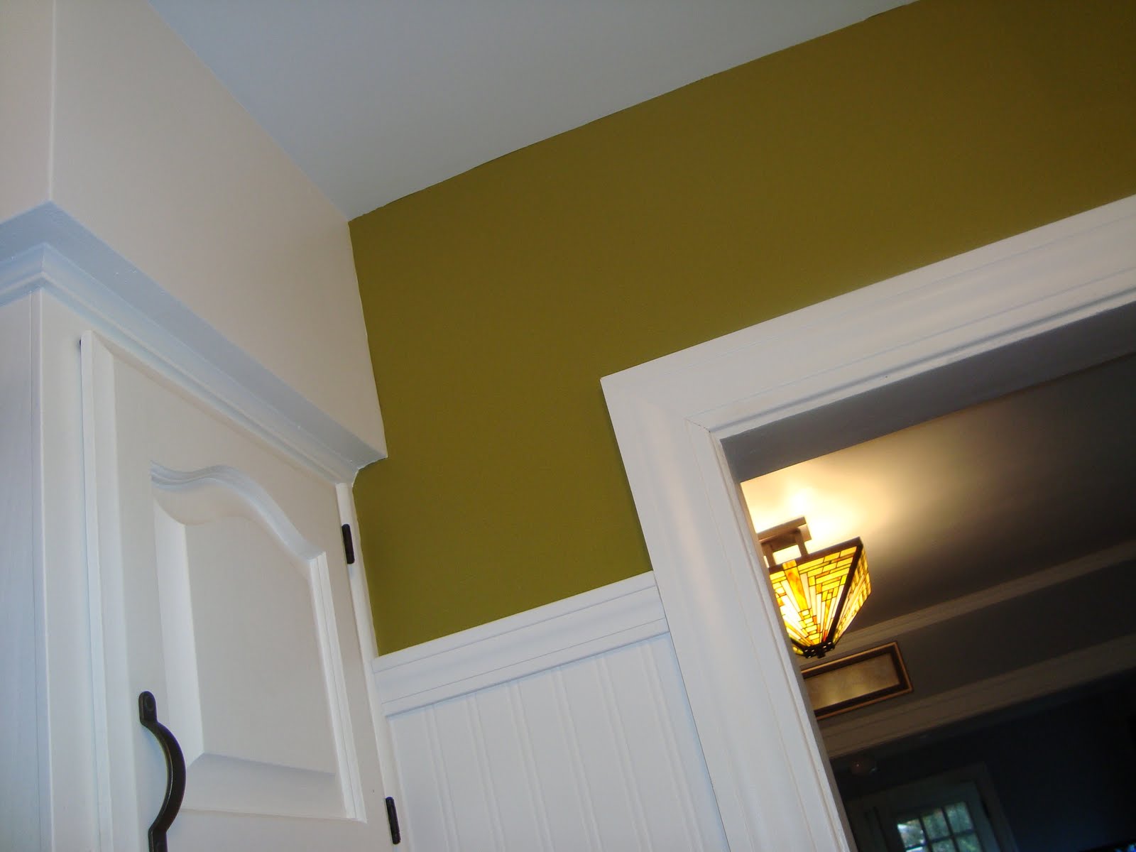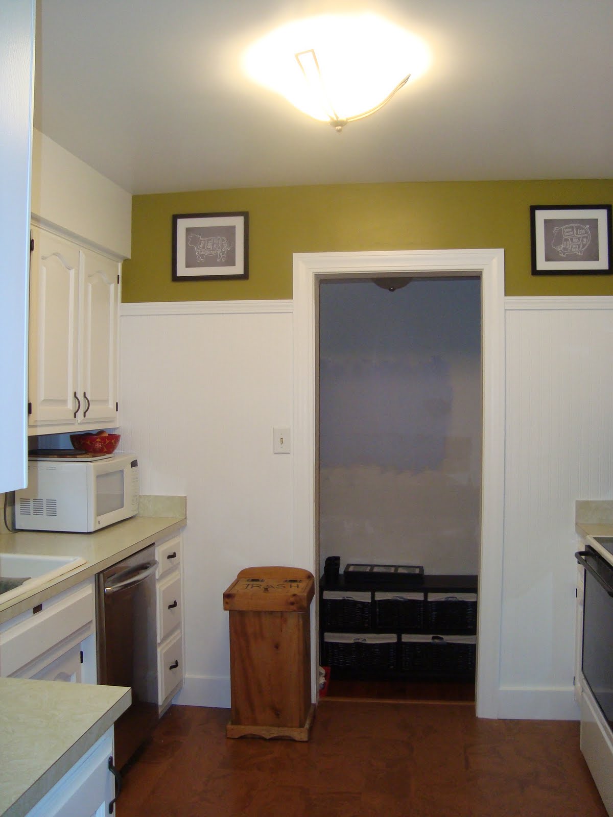 Now, back to the work … Let me. Tell you. The walls in this room are weird. I mean some are wood, some are plaster, and there were stains on them that I couldn’t quite figure out. Gross. So, to diminish the visibility of said grossness, I wallpapered, and then painted. Yep – you read that right. But I did it in a way that hopefully new home-owners won’t hate me for. I used Graham & Brown Beadboard style paintable wallpaper – and it worked like a charm. It took me a few hours to put it up (and it was soft and easy on flat walls; just ripped and tore around outlets and corners, but overall – great!). Then, I gave it a couple of days to fully adhere before painting. It was nice because it was being painted the same color as the trim – so barely any cutting in and it went rather quickly (so glad we planned it that way!). I only wallpapered about 2/3 of the way up the wall, then we installed rail to finish that off (like the first picture above!). I wanted a color in there, since most of the rest of our house is painted gray (like the first picture above.). We chose to go with a green to pull the accent color from the LR/DR into the kitchen (like the second picture above!). It’s called Retro Avocado (a bit darker/less limey than the second picture above.). And, the wallpaper was SUCH a good idea because it took almost 4 coats of paint just to cover the green part of the wall (only did 2 coats on the wallpaper). Most of the green was painted on primed, new drywall from when the contractors built our new, non-hobbit ceiling. But, if you look closely, you can see how the gross walls still looked crappy even with 4 coats of paint (paint & primer in one, actually) … but with the pictures up there it’s not too visible unless you know what you’re looking for (and I’m not going to point it out to you!). The wallpaper saved us an immense amount of time painting and cutting in (the worst, let me say that again – the worst). And gives the kitchen a much awesomer look and feel. It looks so good – with the white cabinets, white walls, rail … And, to top it all off, our kitchen looks bigger and taller now!