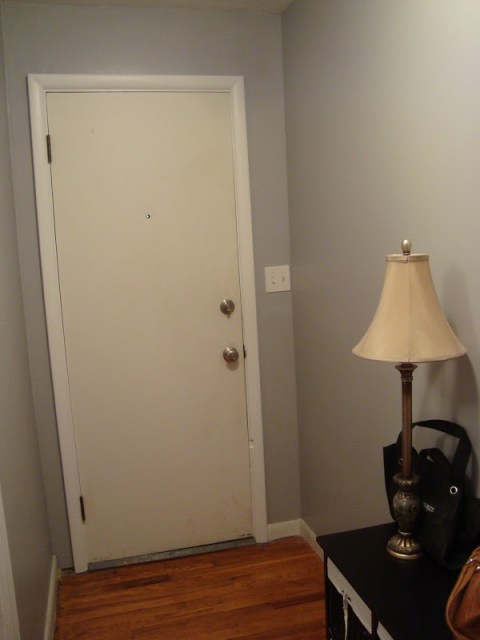 But, I’ll be honest. The door? It doesn’t look great. In the light, you can still see all of the paint that I couldn’t get out of the wood grain. In the dark of the evening, it looks pretty damn sweet though, and really transforms the room. I stripped and sanded and stained it. And, really just needed more time. We can’t just leave the door off the front of our house while we both head off to work … so I only have limited chunks of time to devote to this project. I’m going to have to scrape all of that paint out if I want to leave it stained … but we had to put the door back up on the hinges … so it’s going to have to look like this for a while (probably till next Spring). But I left off the poly, so it’ll be easy to keep working on it over the next months … chipping away at scraping the paint out a little at a time. (I’m not worried, our door is under a descent porch, and behind a glass door all winter.)