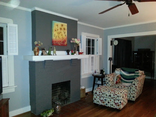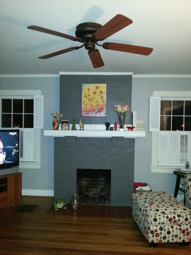 I am not a fan of painted brick. I think that it almost always looks better as original brick; even if it’s not the traditional red brick. (I feel this way about nice wood paneling also.) We tried to strip the paint off of the brick fireplace when we fist moved it. It did not work well; and with all of the other projects we had mounting up at that time, we decided that we couldn’t spend the energy on that one. I’ve always been kind of bummed about it. So, I’ve been racking my brain as to what we could do to make it better, when I came across some pictures on Pinterest and decided to do this: